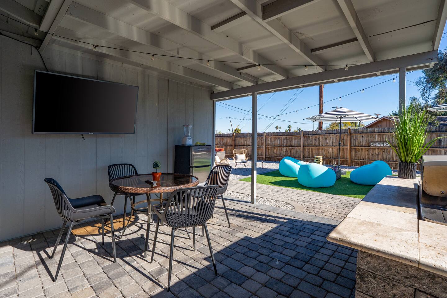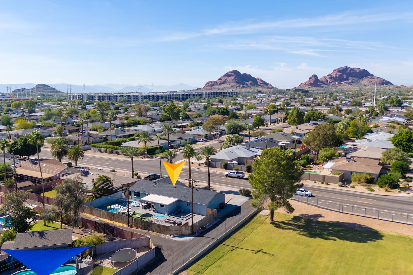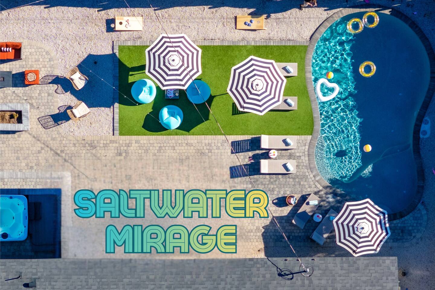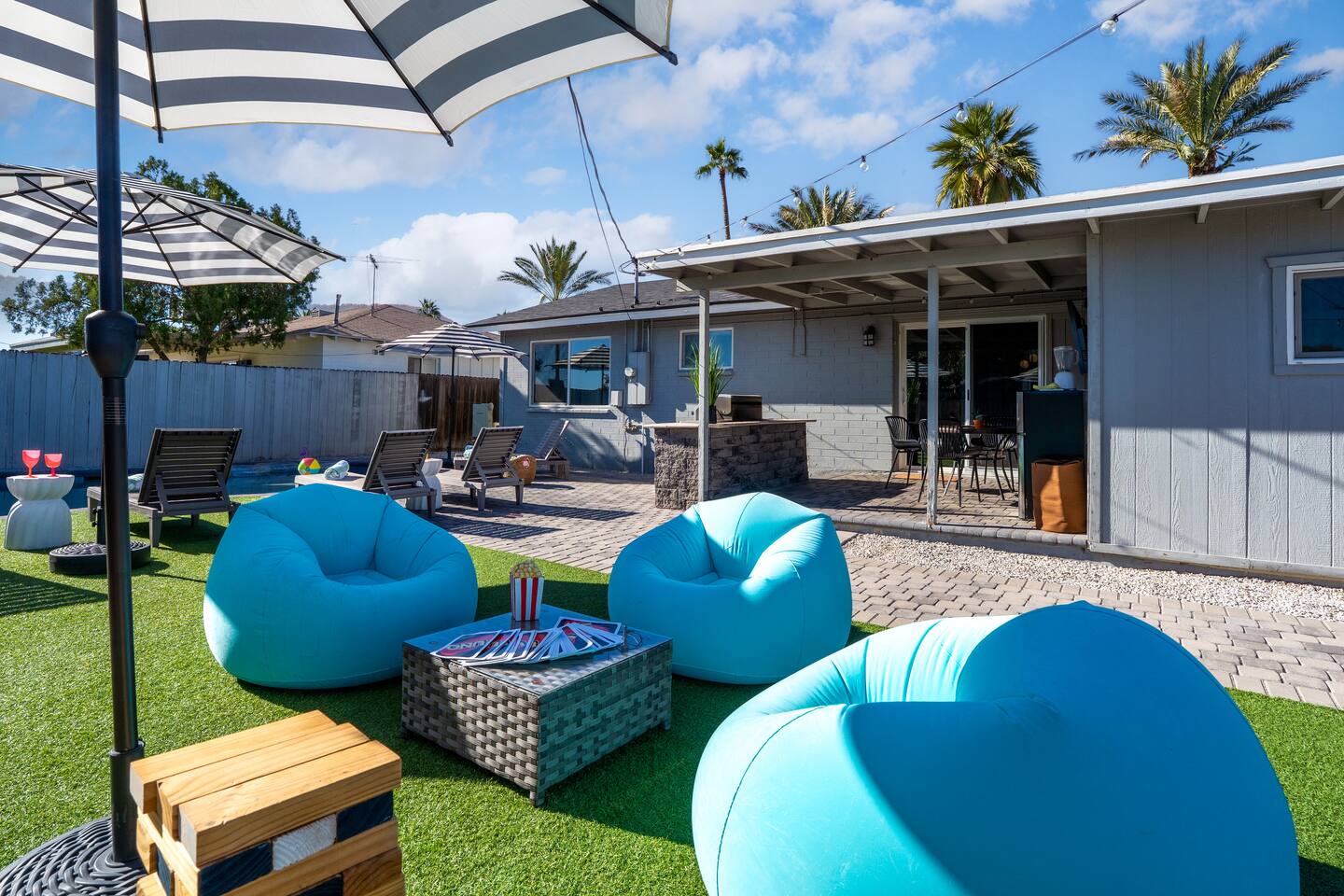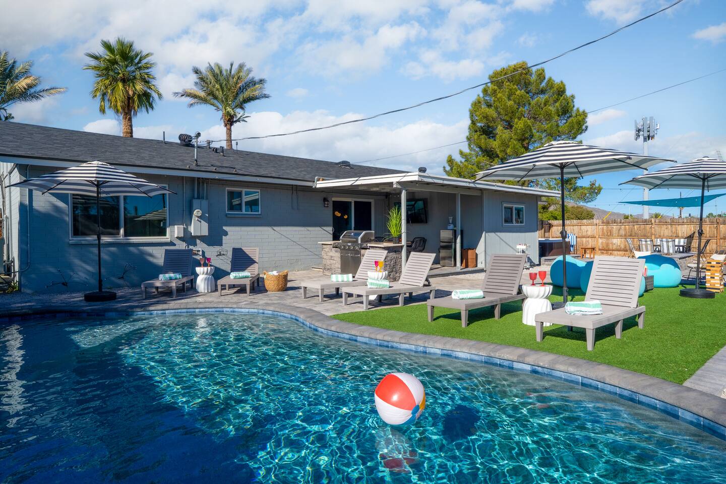 🌵 Prime Scottsdale Location Minutes from Old Town Scottsdale, you’ll have access to top rated restaurants, vibrant nightlife, world class golf, hiking trails, and shopping. You’re also within walking distance to grocery stores, coffee shops, and local eateries. This location can't be beat. 🏝 Resort Style Backyard Oasis Your private outdoor paradise includes: • Expansive saltwater pool with a built-in Baja shelf • 6 resort style chaise loungers ideal for sunbathing and poolside relaxation • Fire pit lounge pit with cushioned seating zones designed for relaxation • Built in BBQ, outdoor fridge, & prep area • Outdoor dining table • Outdoor TV for game days, movie nights, or poolside streaming • Ping pong, cornhole & yard games to elevate your stay • Ambient outdoor lighting for a soft, glamorous glow at night Every corner of the backyard is thoughtfully designed to feel like a boutique desert hideaway. ☀️Luxe, Newly Remodeled Interior The Saltwater Mirage features high-end finishes and comfortable accommodations for up to 14 guests across 9 beds, with 2 additional cots. Enjoy a serene primary suite with plush bedding, a fully stocked chef ready kitchen, stocked coffee bar, and a dedicated beauty bar perfect for groups getting ready together. ---------------------------------- 🛏 Sleeping Arrangements Bedroom #1 • King bed with plush linens Bedroom #2 • Queen bed + dedicated workspace with external monitor Bedroom #3 • Queen bed • Twin-over-Twin bunk Bedroom #4, Bunk Room • Two Full-over-Full bunk beds Extras: • 2 twin cots available • Pack & Play crib • High-quality mattresses, linens & pillows throughout Sleeps up to 14 guests across 9 beds + 2 optional cots ---------------------------------- 🛎️ Amenties Indoor • Fast WiFi • Chef ready kitchen • Coffee bar • 3 TVs (including outdoor TV) • Games, books & entertainment • Beauty bar with outlets Outdoor • Heated saltwater pool with resort style Baja shelf • Fire pit lounge area • Builtin BBQ with outdoor fridge • Alfresco dining table • Outdoor TV • Cornhole, jenga, and yard games 🔑 Guest Access Guests enjoy exclusive access to the entire home and private resort-style backyard. ⚠️ Other Things to Note • Pool heating available for $50/day • Scottsdale quiet hours & noise ordinances strictly enforced • Designed for elevated, responsible enjoyment Scottsdale License # 2041714