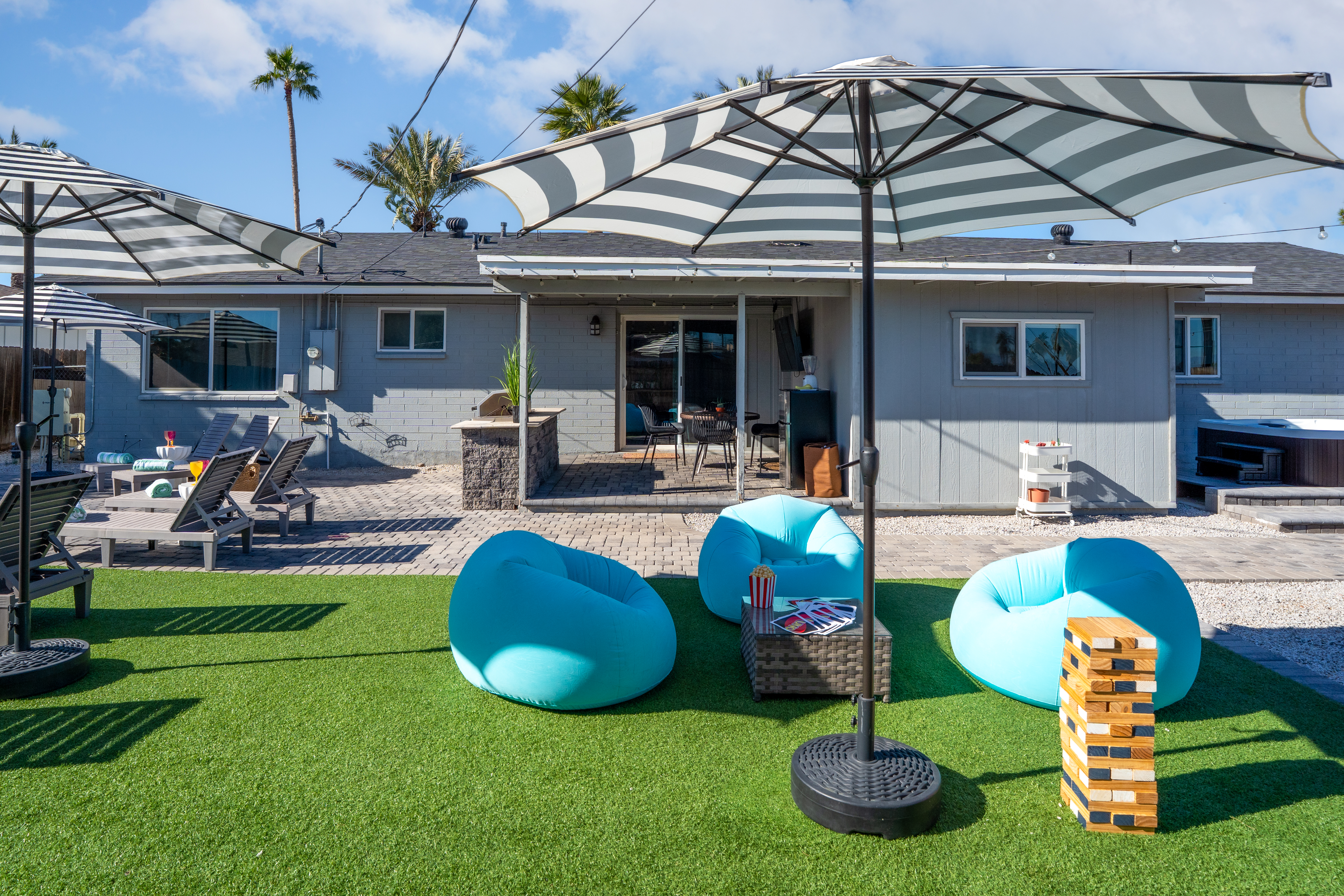 🌵 Prime Scottsdale Location Minutes from Old Town Scottsdale, you’ll have access to top rated restaurants, vibrant nightlife, world class golf, hiking trails, and shopping. You’re also within walking distance to grocery stores, coffee shops, and local eateries. This location can't be beat. 🏝 Resort Style Backyard Oasis Your private outdoor paradise includes: • Expansive saltwater pool with a built-in Baja shelf • 6 resort style chaise loungers ideal for sunbathing and poolside relaxation • Fire pit lounge pit with cushioned seating zones designed for relaxation • Built in BBQ, outdoor fridge, & prep area • Outdoor dining table • Outdoor TV for game days, movie nights, or poolside streaming • Ping pong, cornhole & yard games to elevate your stay • Ambient outdoor lighting for a soft, glamorous glow at night Every corner of the backyard is thoughtfully designed to feel like a boutique desert hideaway. ☀️Luxe, Newly Remodeled Interior The Saltwater Mirage features high-end finishes and comfortable accommodations for up to 14 guests across 9 beds, with 2 additional cots. Enjoy a serene primary suite with plush bedding, a fully stocked chef ready kitchen, stocked coffee bar, and a dedicated beauty bar perfect for groups getting ready together. ---------------------------------- 🛏 Sleeping Arrangements Bedroom #1 • King bed with plush linens Bedroom #2 • Queen bed + dedicated workspace with external monitor Bedroom #3 • Queen bed • Twin-over-Twin bunk Bedroom #4, Bunk Room • Two Full-over-Full bunk beds Extras: • 2 twin cots available • Pack & Play crib • High-quality mattresses, linens & pillows throughout Sleeps up to 14 guests across 9 beds + 2 optional cots ---------------------------------- 🛎️ Amenties Indoor • Fast WiFi • Chef ready kitchen • Coffee bar • 3 TVs (including outdoor TV) • Games, books & entertainment • Beauty bar with outlets Outdoor • Heated saltwater pool with resort style Baja shelf • Fire pit lounge area • Builtin BBQ with outdoor fridge • Alfresco dining table • Outdoor TV • Cornhole, jenga, and yard games 🔑 Guest Access Guests enjoy exclusive access to the entire home and private resort-style backyard. ⚠️ Other Things to Note • Pool heating available for $50/day • Scottsdale quiet hours & noise ordinances strictly enforced • Designed for elevated, responsible enjoyment Scottsdale License # 2041714